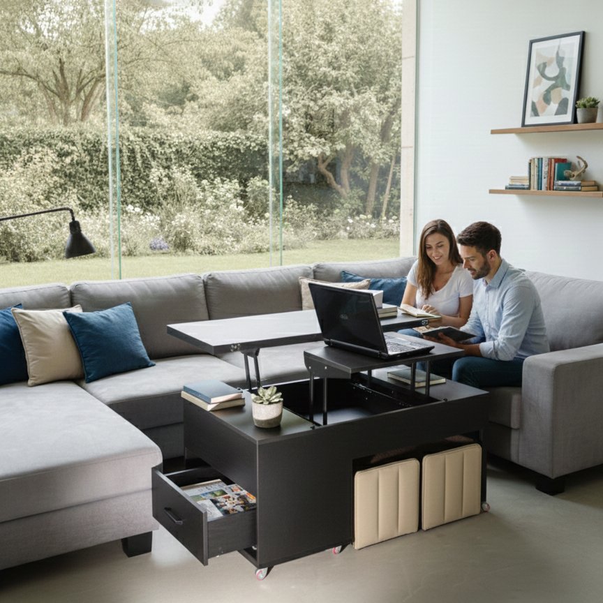 ترابيزة ذكية ميكانيزم يفتح مكتب و سطح منطبق يفتح سفرة تسع 8 أخاص, التربيزة ها درجين و اماكن للخزين و تشمل 4 بوفات تنجيد جلد , مصنوعة من خشب الإم دي إف مع قشرة الميلامين عالية الجودة
